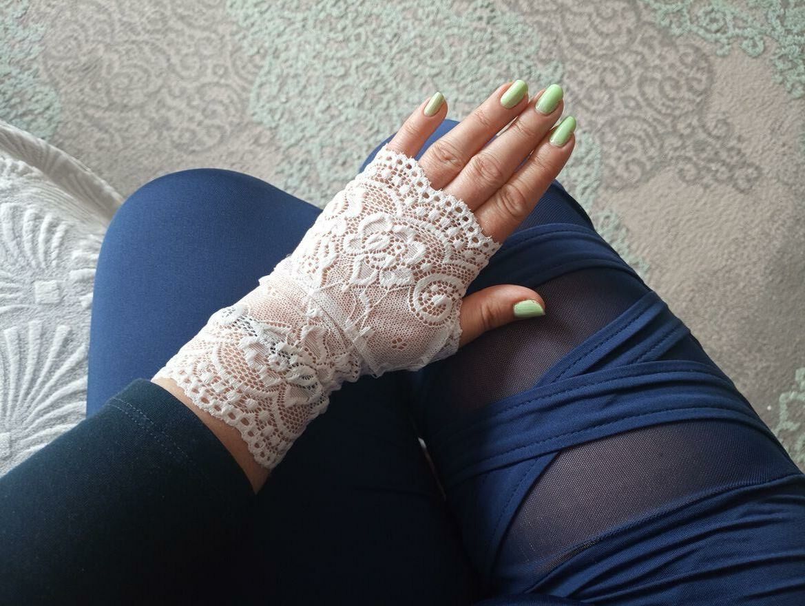Białe rękawiczki bez palców uszyte z kwiatowej elastycznej koronki. Rozmiar uniwersalny. Wysyłka listem poleconym 10 zł.Katarzyna