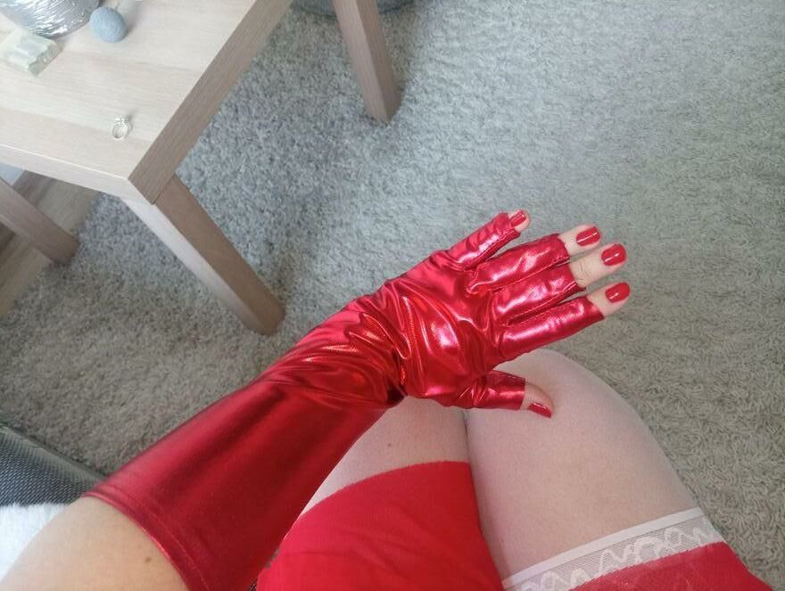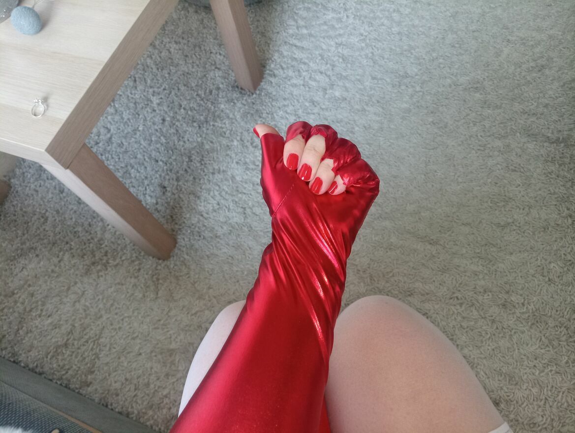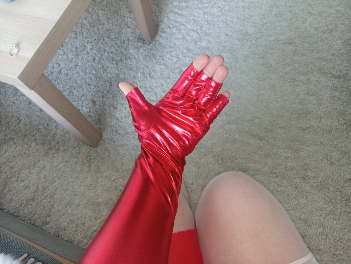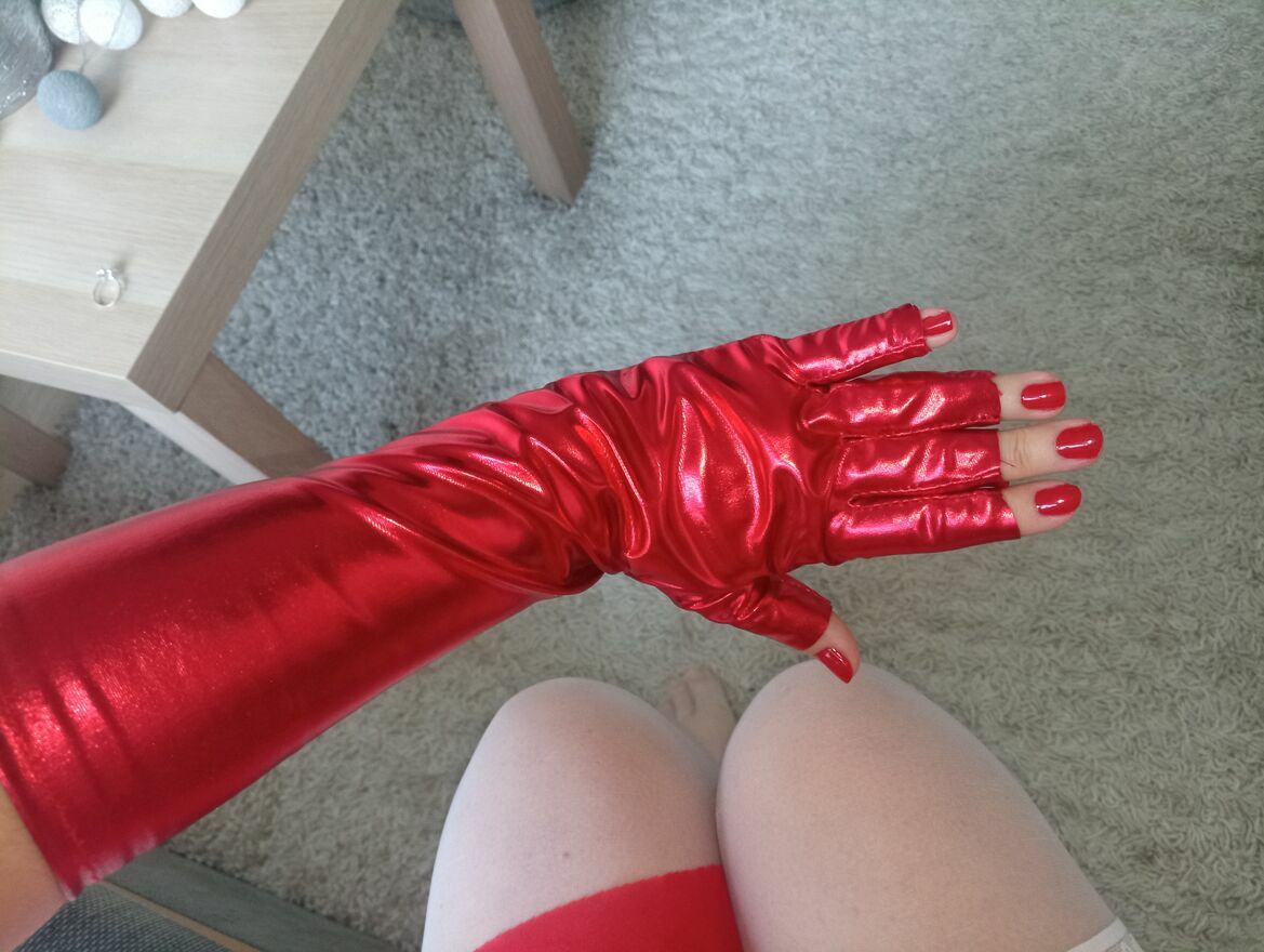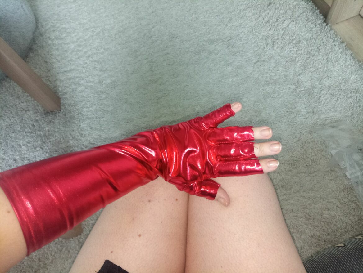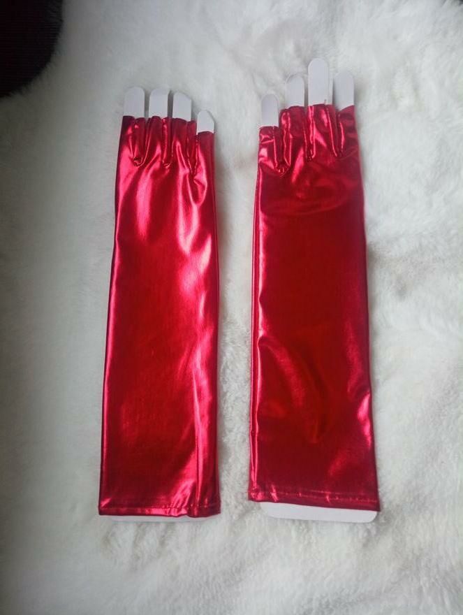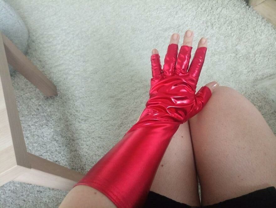 Efektowne rękawiczki bez palców z imitacji lateksu w ognistym czerwonym odcieniu. Nowe. Wysyłka listem poleconym 10 zł.Katarzyna