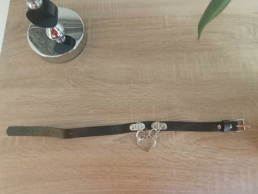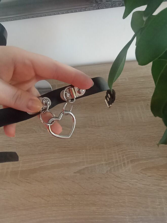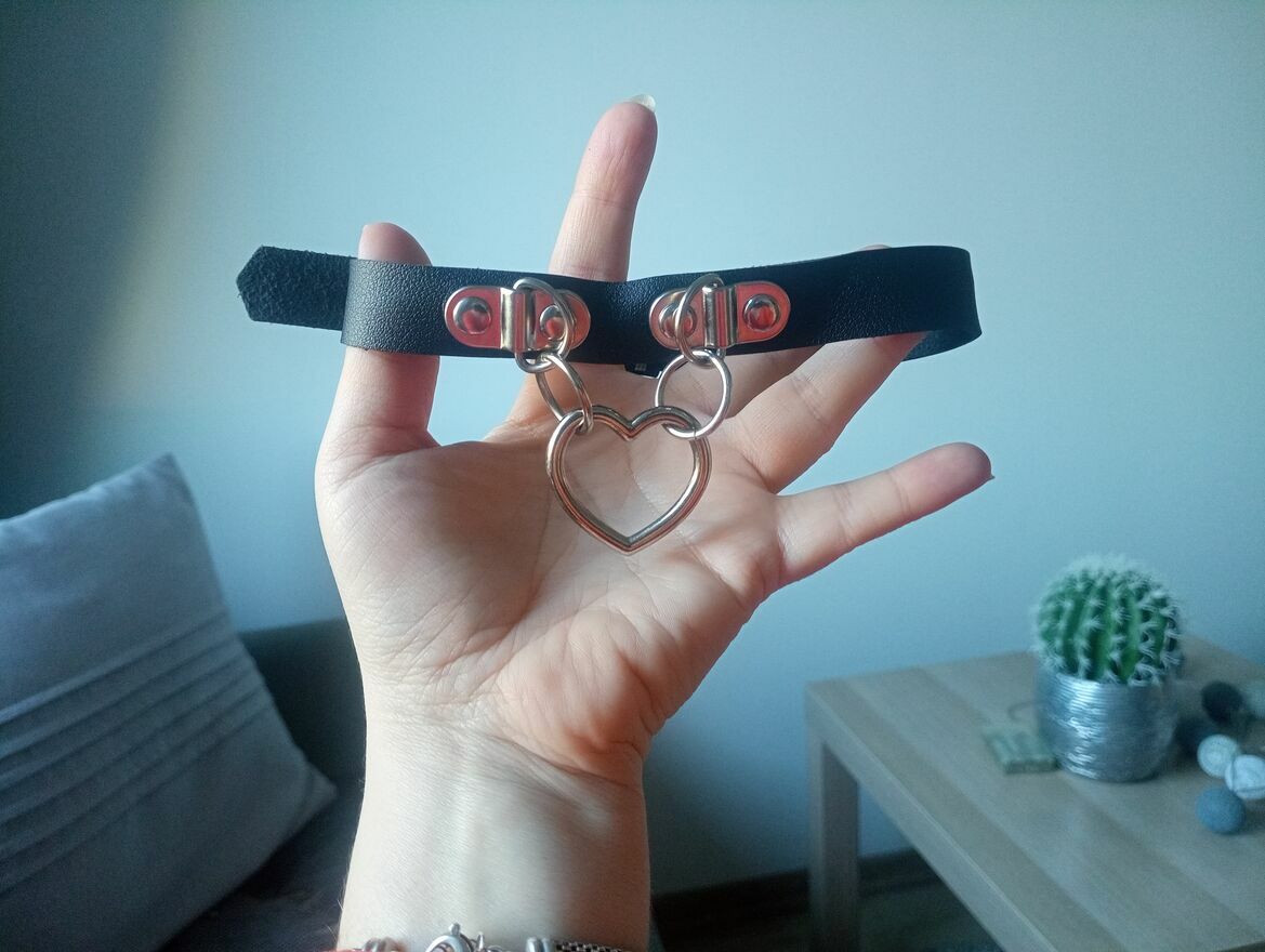 Oryginalny choker z dużym metalowym sercem na prostej obrazy paskowej. Super ozdoba w nieco drapieżnym, rockowym stylu. Nowa. Długość 47 cm. Wysyłka paczką pocztową 16 zł.Katarzyna