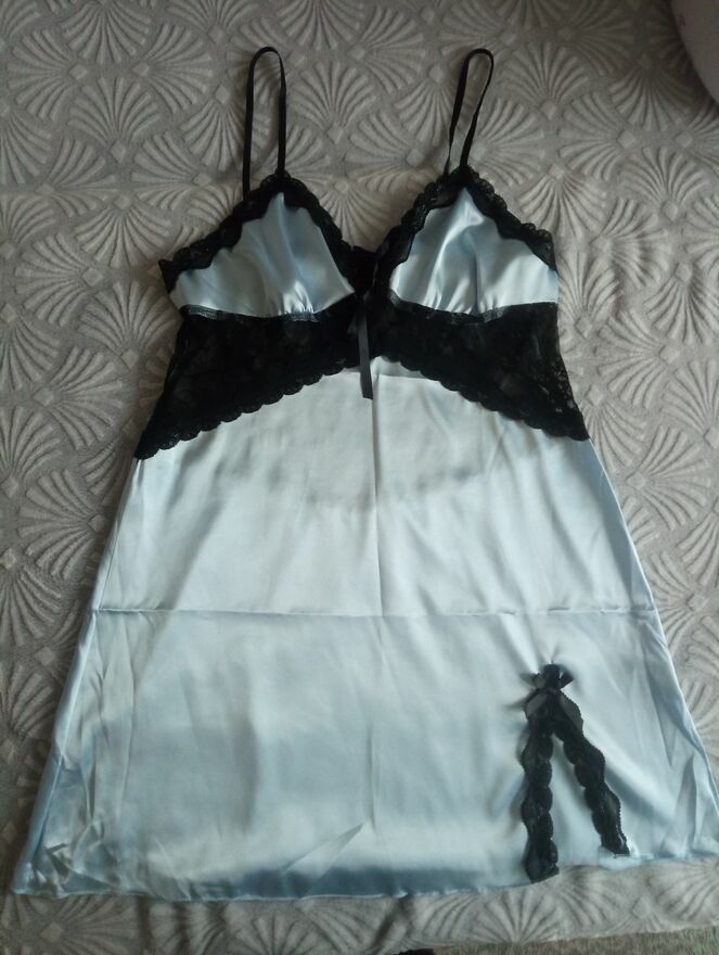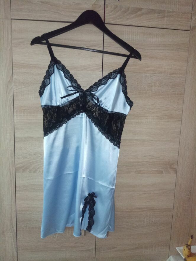 Prześliczna, blekitno-czarnej koszulka nocna uszyta z elastycznej satyny i koronki. Zmysłowa i pełna elegancji. Nowa. Rozmiar XL. Wysyłka paczką pocztową 16 zł.Katarzyna