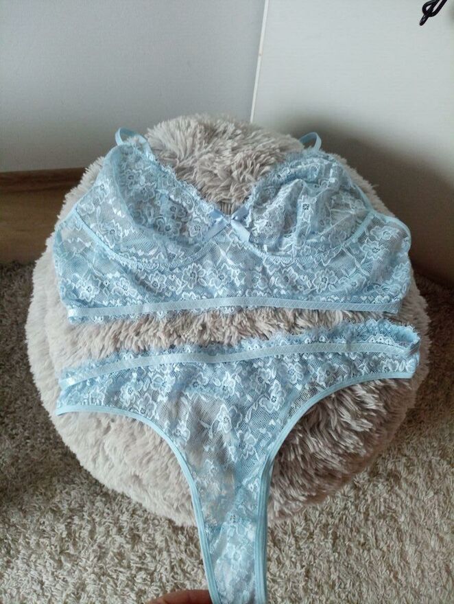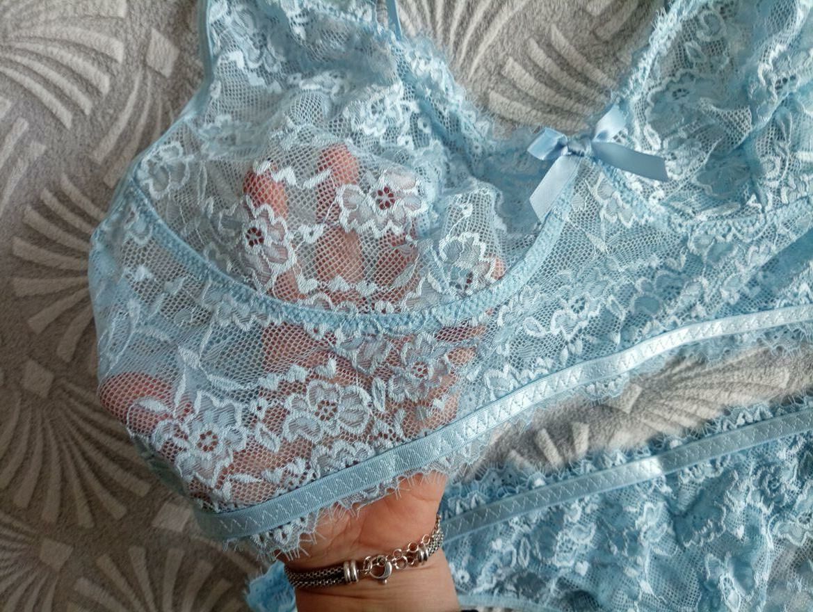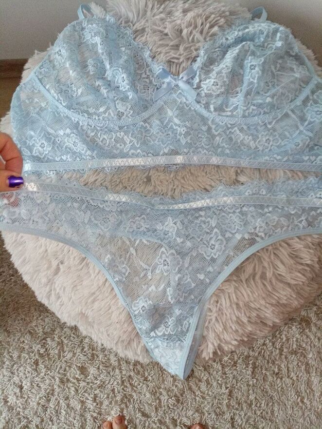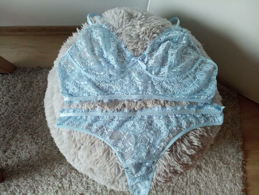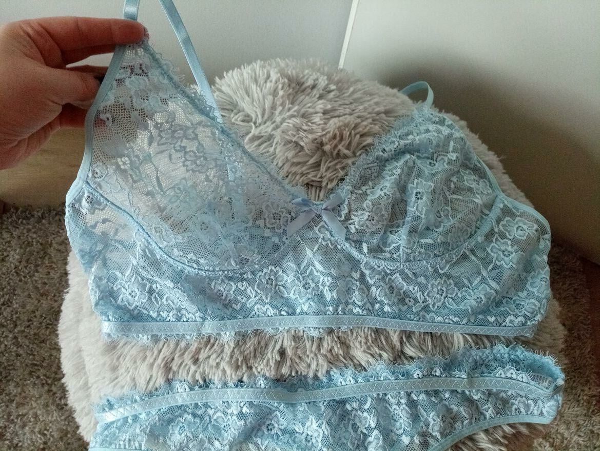 Przepiękny, super wygodny błękitny komplet bielizny bezfiszbinowej z majtkami o fasonie stringow. Wygodny krój, odmładzający kolor, spektakularny efekt. Nowe. Rozmiar XL/2 XL. Wysyłka paczką pocztową 16 zł.Katarzyna