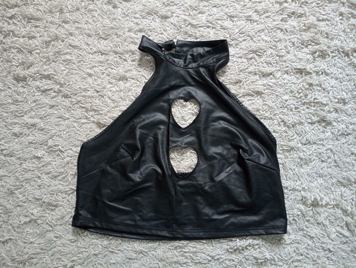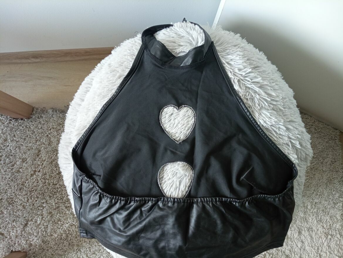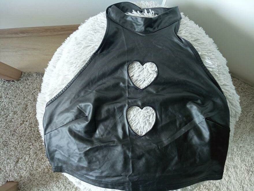 Urocza kusząca bluzeczka z miękkiej imitacji lateksu z ażurowymi sercami na przodzie. Stan bardzo dobry. Pasuje na XL/2XL. Wysyłka paczką pocztową 16 zł.Katarzyna