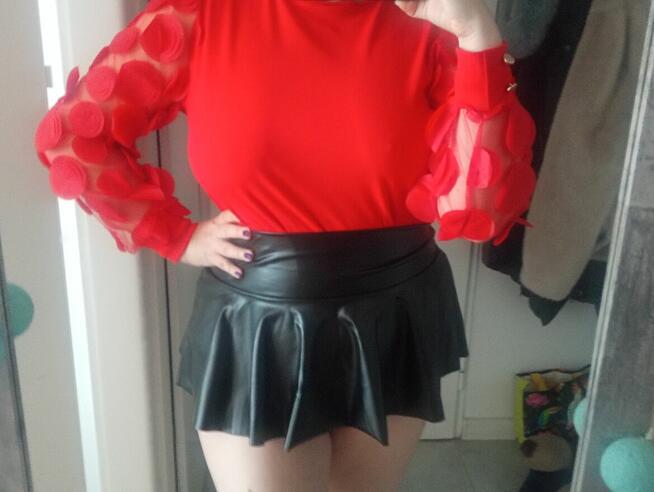 Kobieca bluzka odsłaniająca ramię wykonana z miękkiej imitacji lateksu i tiulowych rękawów. Nowa. Rozmiar XL. Wysyłka ...