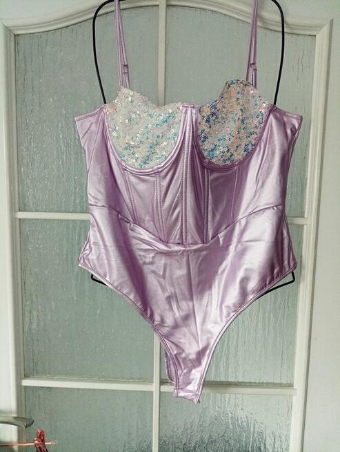 Efektowne, jasnofioletowe metaliczne body z ecoskóry z mieniąca się cekinowa ozdobna częścią stanikowa. Oryginalny ...