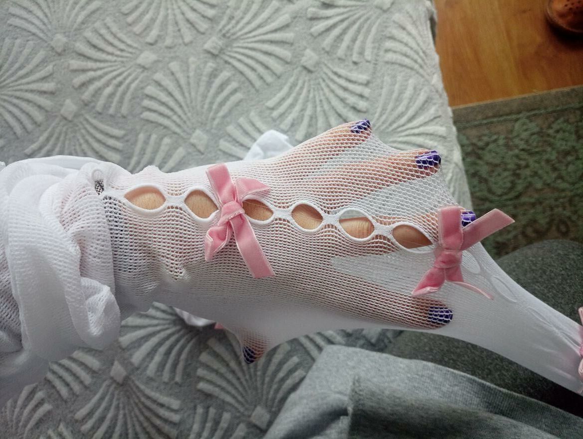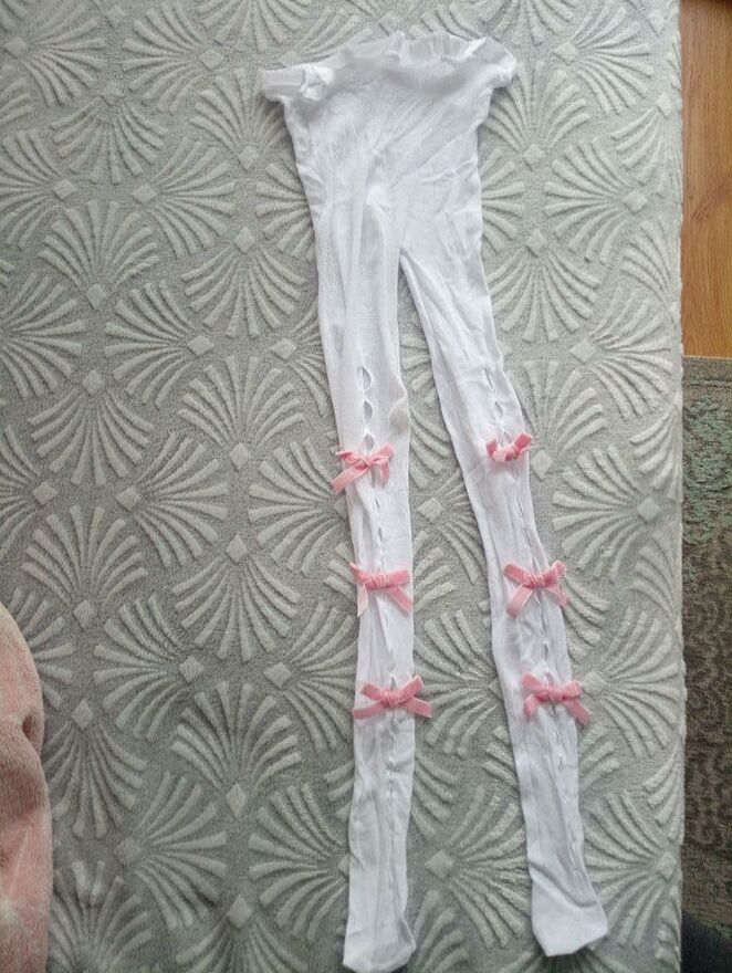 Przeurocze, ażurowe białe rajstopy zdobione aksamitnymi różowymi kokardkami. Nowe. Rozmiar uniwersalny. Pasujący też na XL. Wysyłka paczką pocztową 16 zł.Katarzyna