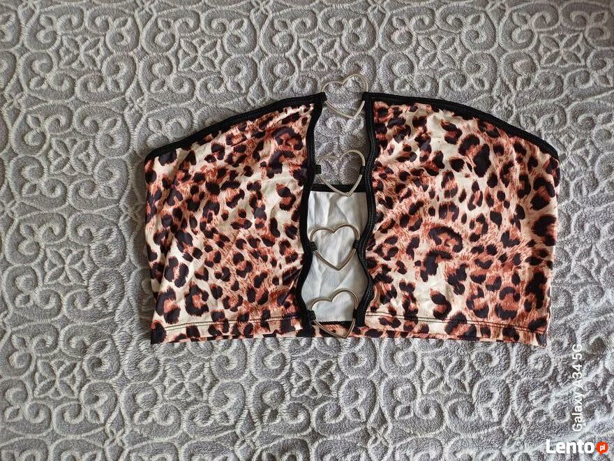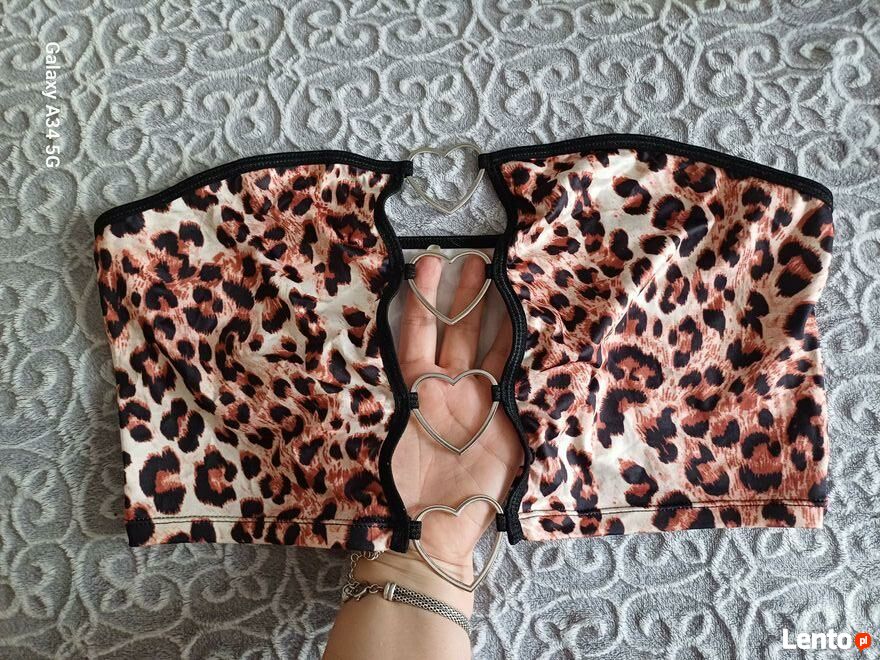 Bardzo pociągający, rozpalający zmysły top dla odważnych kobiet, w modnym, zwierzecym princie. Zdobiony metalowymi sercami na przedzie. Nowy. Elastyczny. Rozmiar XL. Wysyłka paczka pocztowa 16 zl.Katarzyna