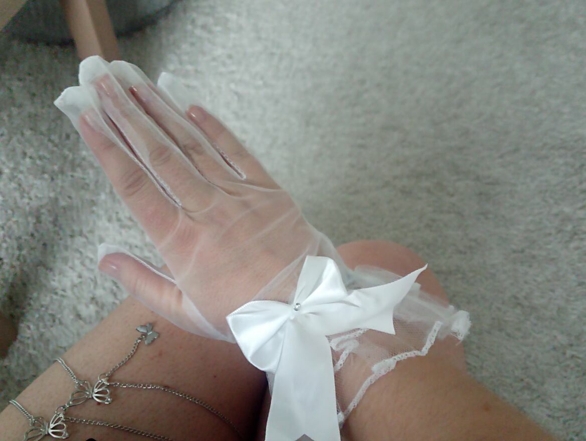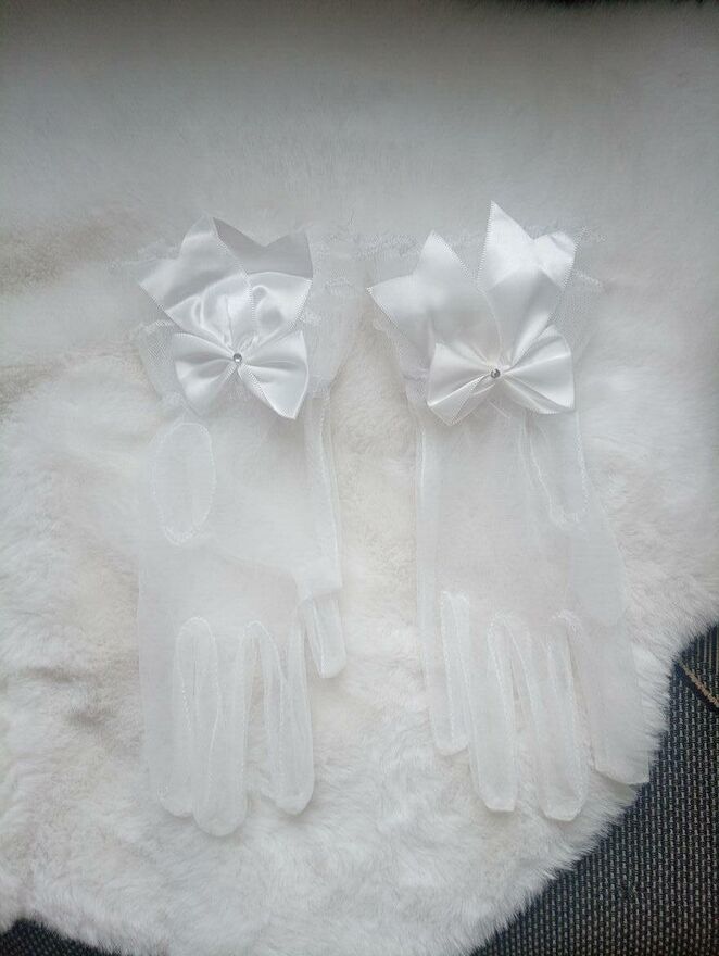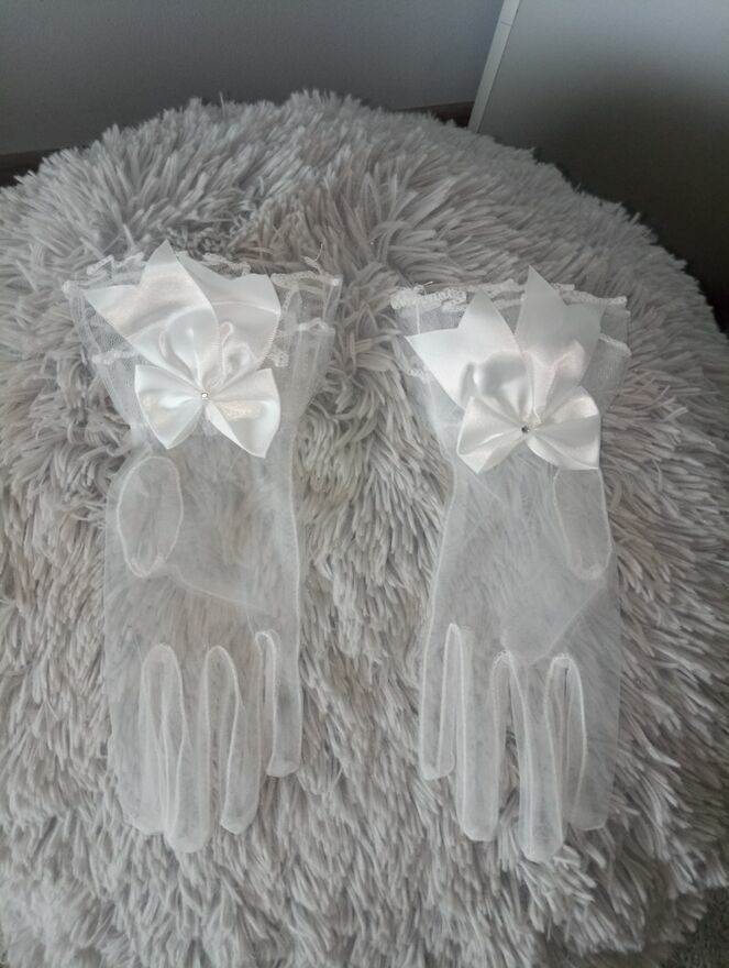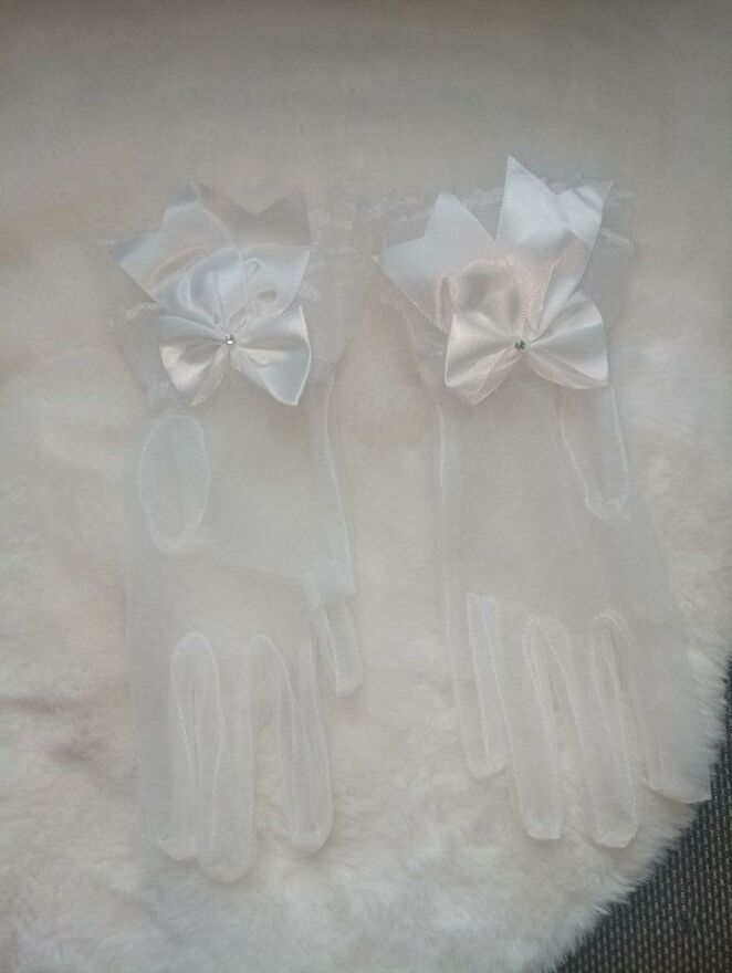 Niezwykle gustowne i piękne białe prześwitujące rękawiczki z dużą kokardą. Wybór prawdziwych elegantek. Nowe. Wysyłka paczką pocztową 16 zł.Katarzyna