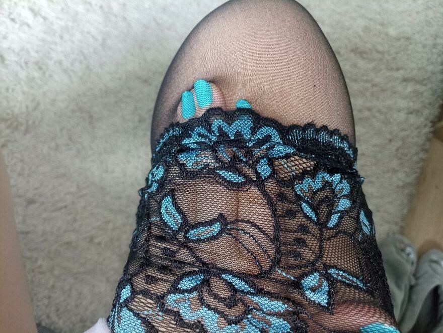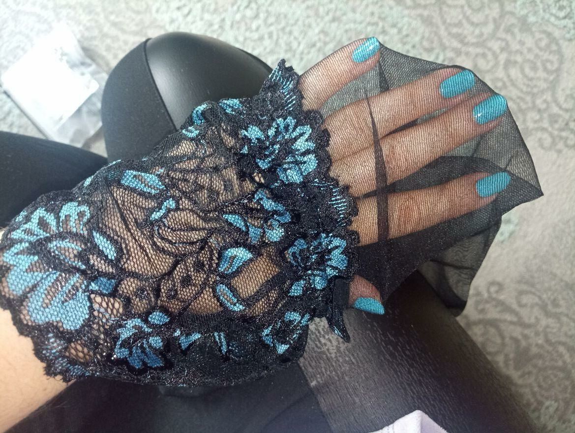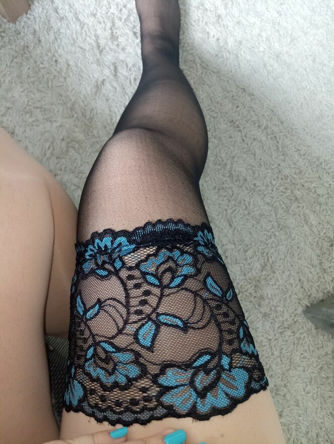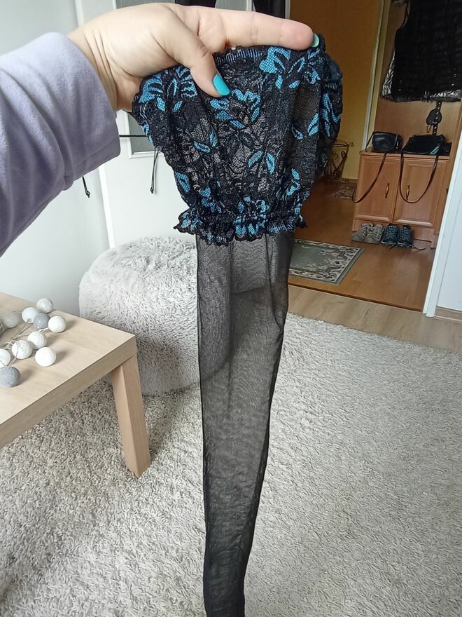 Niezwyklej urody pończochy do pasa z szeroką, niebiesko-czarna kwiatowa manszeta zachwycają zmysłowością i szykiem. Nowe. Rozmiar uniwersalny. Wysyłka listem poleconym 10 zł.Katarzyna